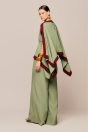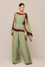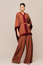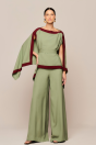 manga estilo morcego e barra bicolor. A calça que acompanha o