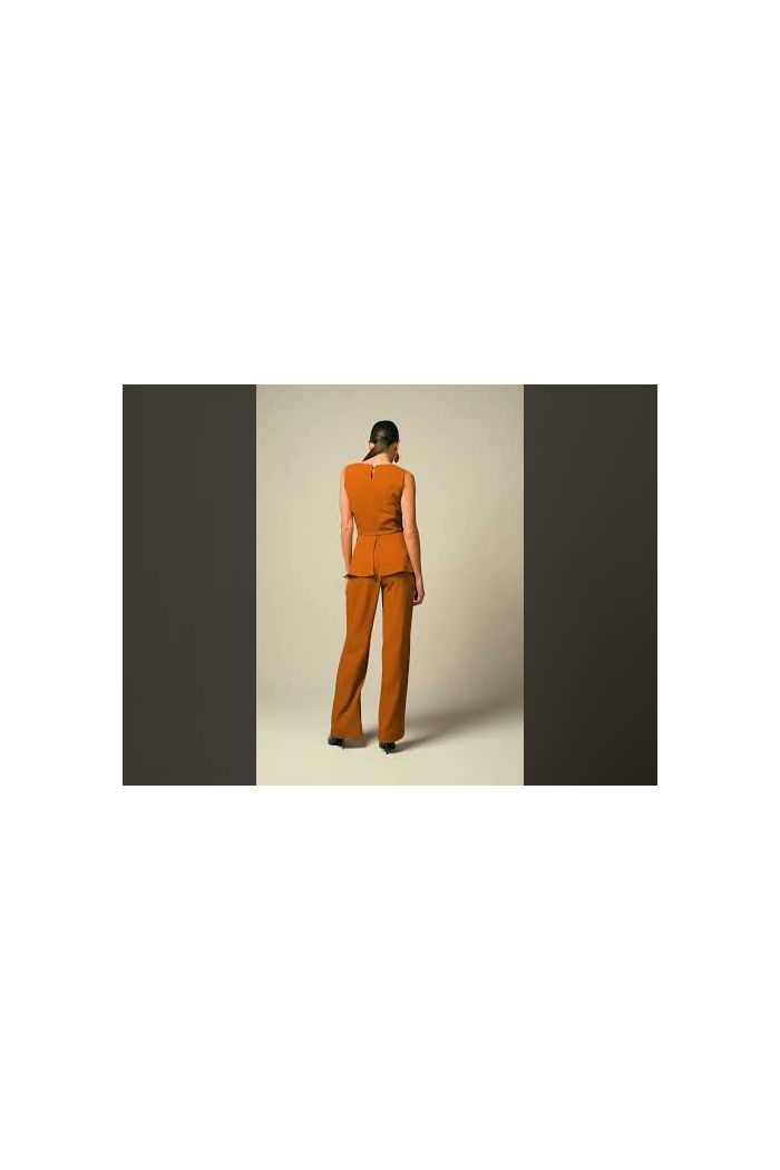Inclui blusa com corte peplum, dupla, com maxi fendas laterais. O
