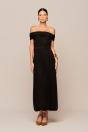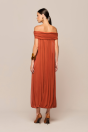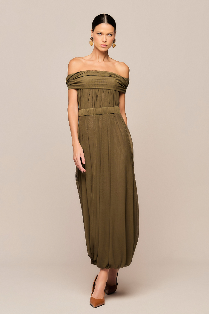 possui comprimento longo e um decote ombro a ombro com detalhe